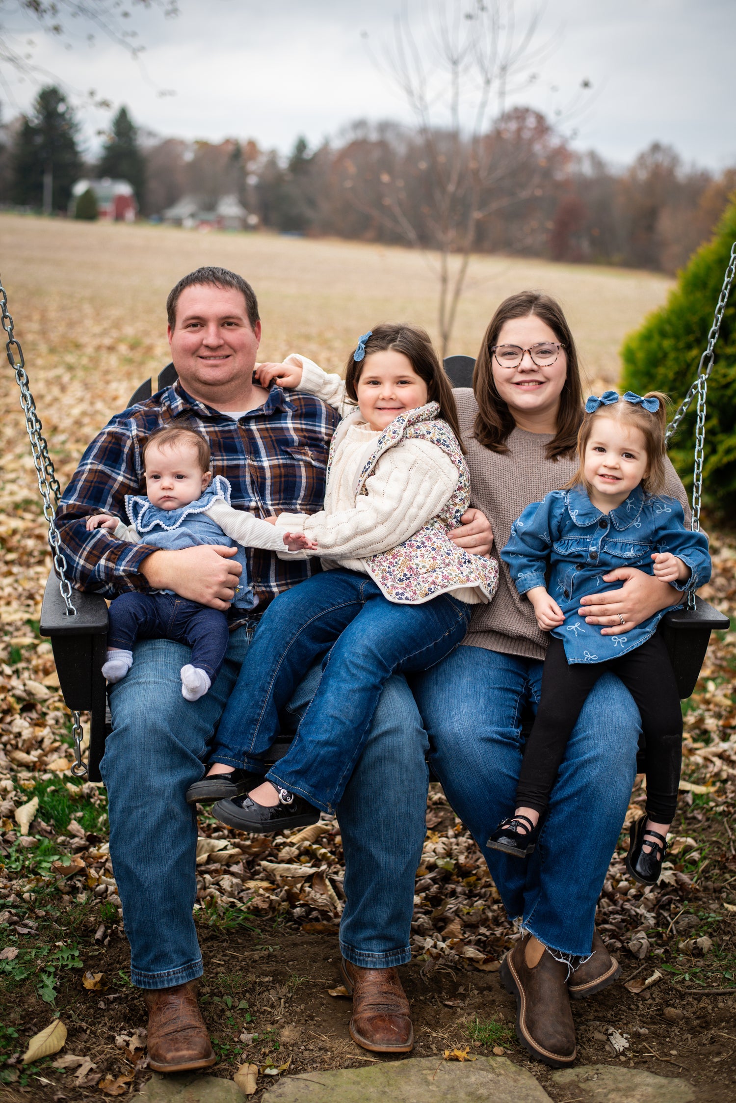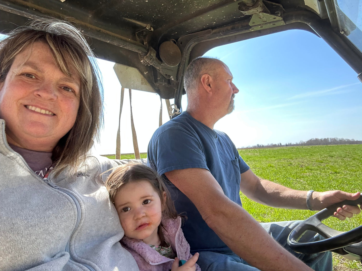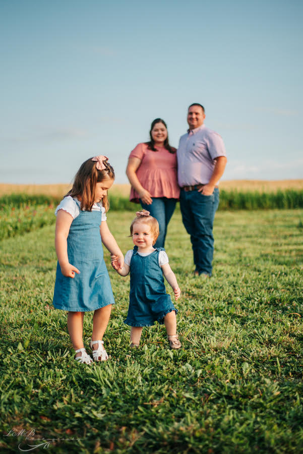 Evan and Sarah are 3rd generation on the farm. Sarah works off the farm, but enjoys helping when she can. Pictured with them are their daughters, Gracie and Anna.